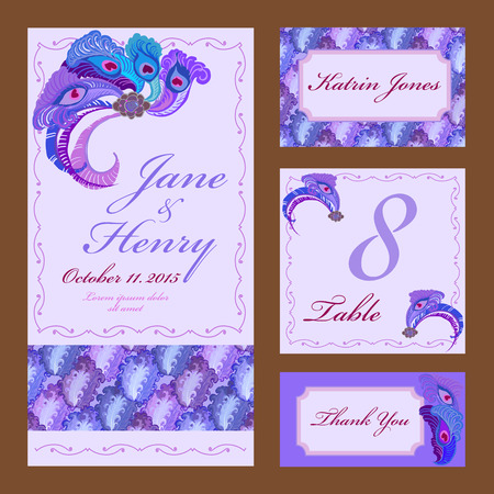 結婚式を祝うために印刷可能な背景を設定します 招待カード テーブル数 ゲスト カード ベクトルの図 孔雀の羽 のイラスト素材 ベクタ Image