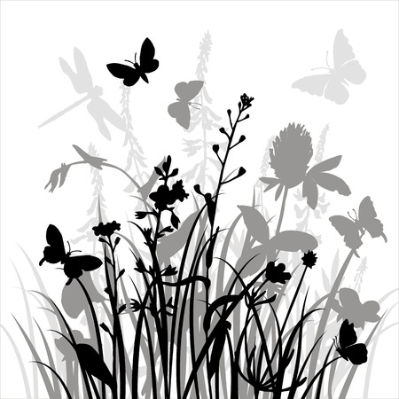野の花と草 野生植物 黒のモノクロ花テンプレートと背景のベクトル シルエット手描き下ろしイラストのイラスト素材 ベクタ Image