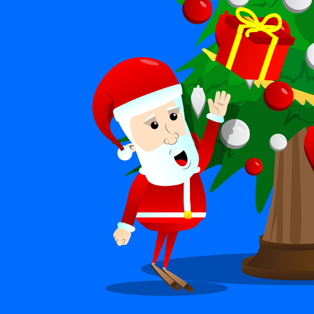 サンタクロースはクリスマスツリーのギフトボックスに手を差し伸べる ベクトル漫画キャラクターイラスト のイラスト素材 ベクタ Image