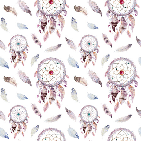 ドリーム キャッチャーと羽のパターン 水彩のボヘミアン装飾 水彩色夢キャッチャー デザイン シームレスな繰り返し色ボヘミアンシック印刷 部族の手には シックな壁紙が描画されます の写真素材 画像素材 Image