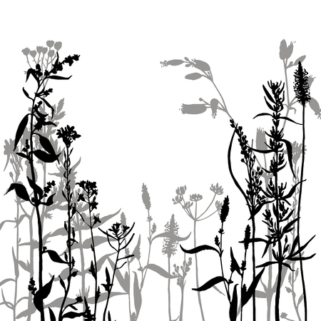 野の花と草 野生植物 黒のモノクロ花テンプレートと背景のベクトル シルエット手描き下ろしイラストのイラスト素材 ベクタ Image