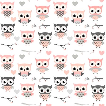 かわいいピンクとグレー漫画フクロウの子供や赤ちゃんのデザイン 招待状や衣類のためのシームレスなパターンのイラスト素材 ベクタ Image